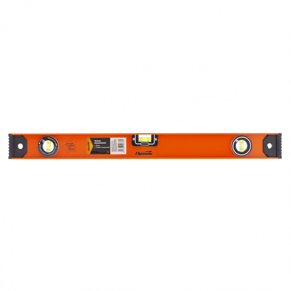 Уровень алюминиевый Sparta «Рельс» 34046 длиной 600 мм имеет 3 глазка, 1 из которых поворотный. С помощью инструмента удобно определять наличие отклонений от горизонтали и вертикали, а также выставлять произвольный угол.