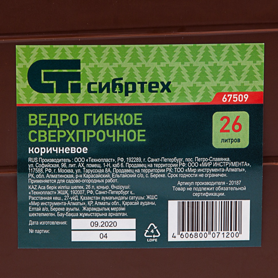 Сверхпрочное гибкое ведро Сибртех 67509 коричневого цвета, объемом 26 л, пригодится на даче, стройке, рыбалке, в быту. В нем можно переносить воду для полива, сыпучие материалы для ремонта, замешивать строительные растворы и хранить корм для животных, также ведро пригодится во время сбора урожая.