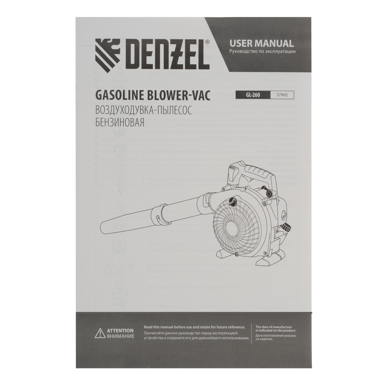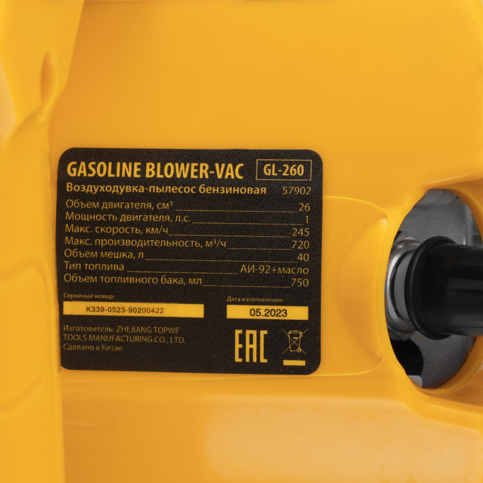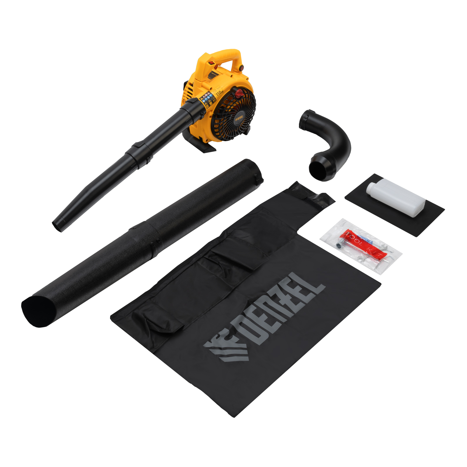 Воздуходувка-пылесос бензиновая – 1 шт, Труба напорная (из двух частей: тип А и тип В) – 1 шт, Труба всасывающая (из двух частей: тип С и тип D) – 1 шт, Труба разгрузочная – 1 шт, Набор инструментов – 1 шт, Дозатор для приготовления смеси – 1 шт, Мешок для мусора с ремнем – 1 шт, Руководство пользователя с гарантийным талоном – 1 шт |