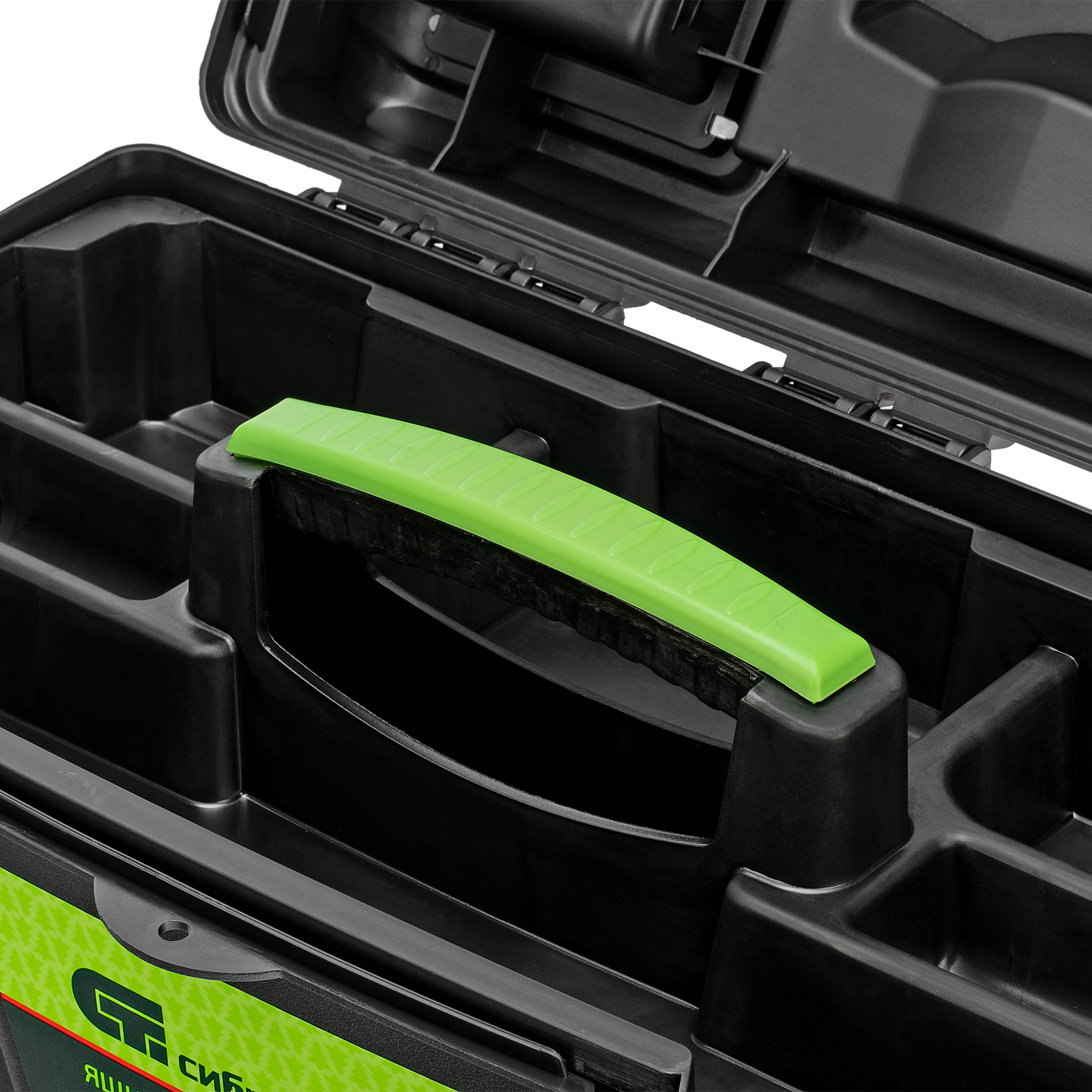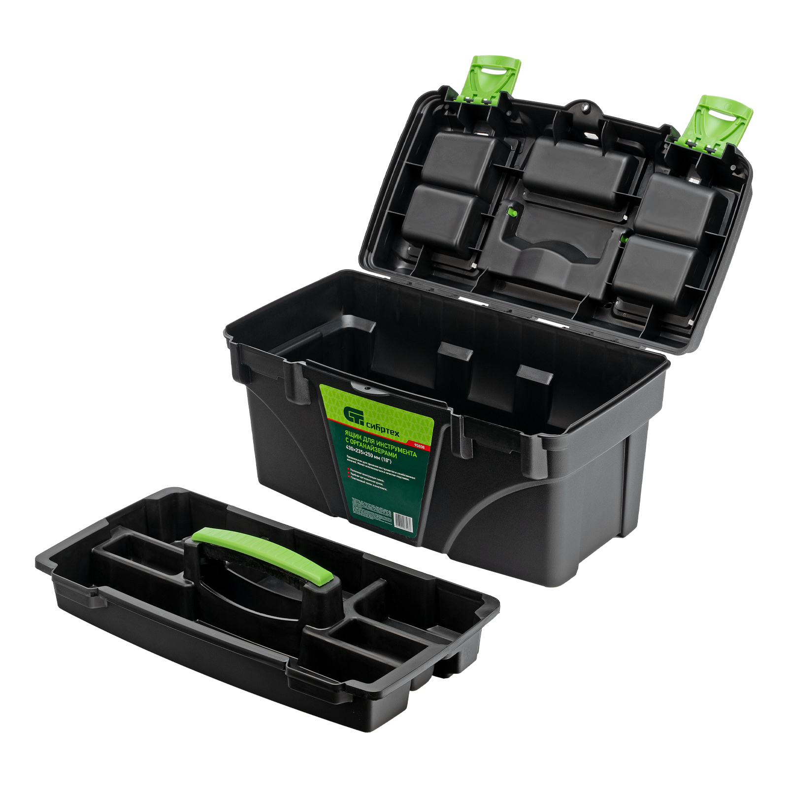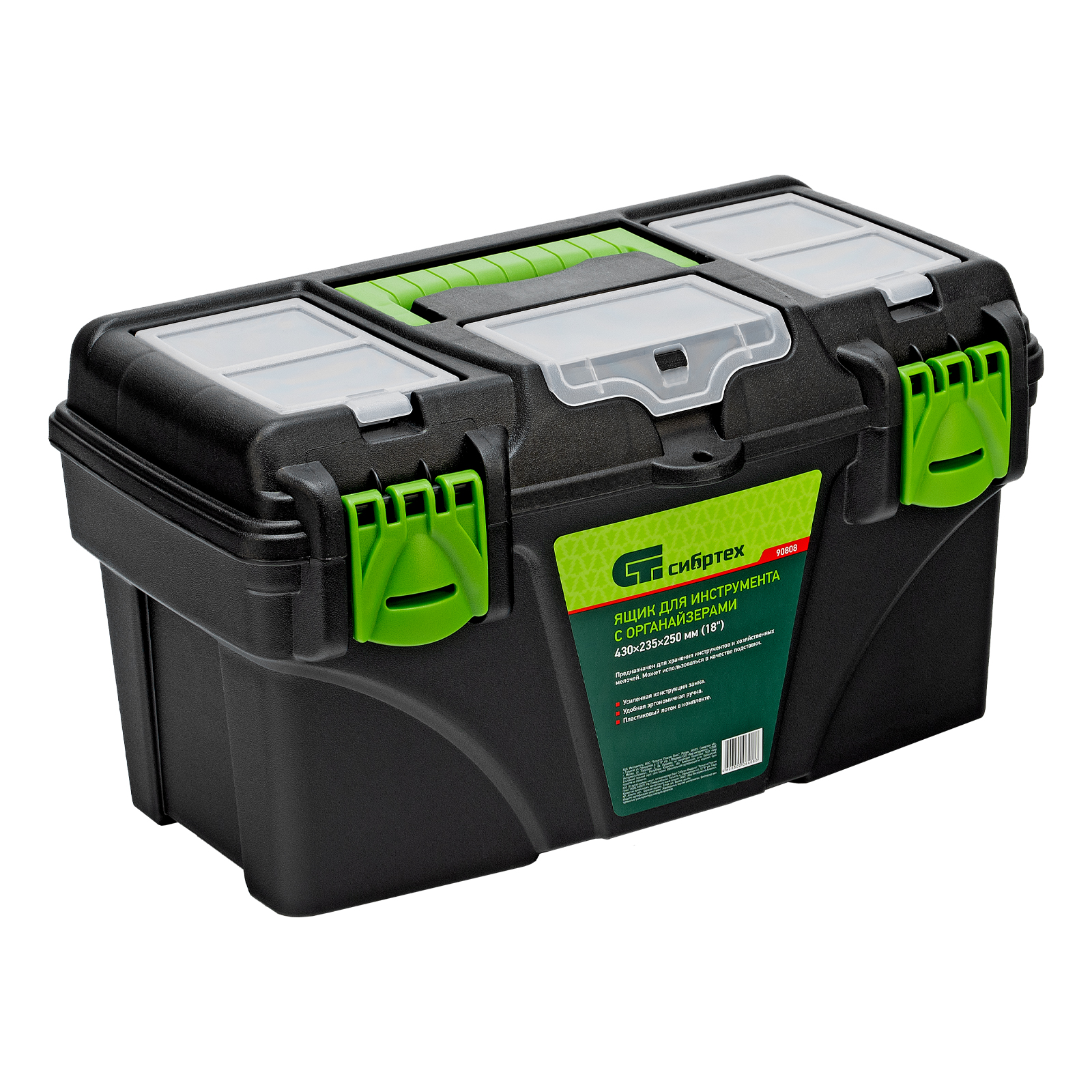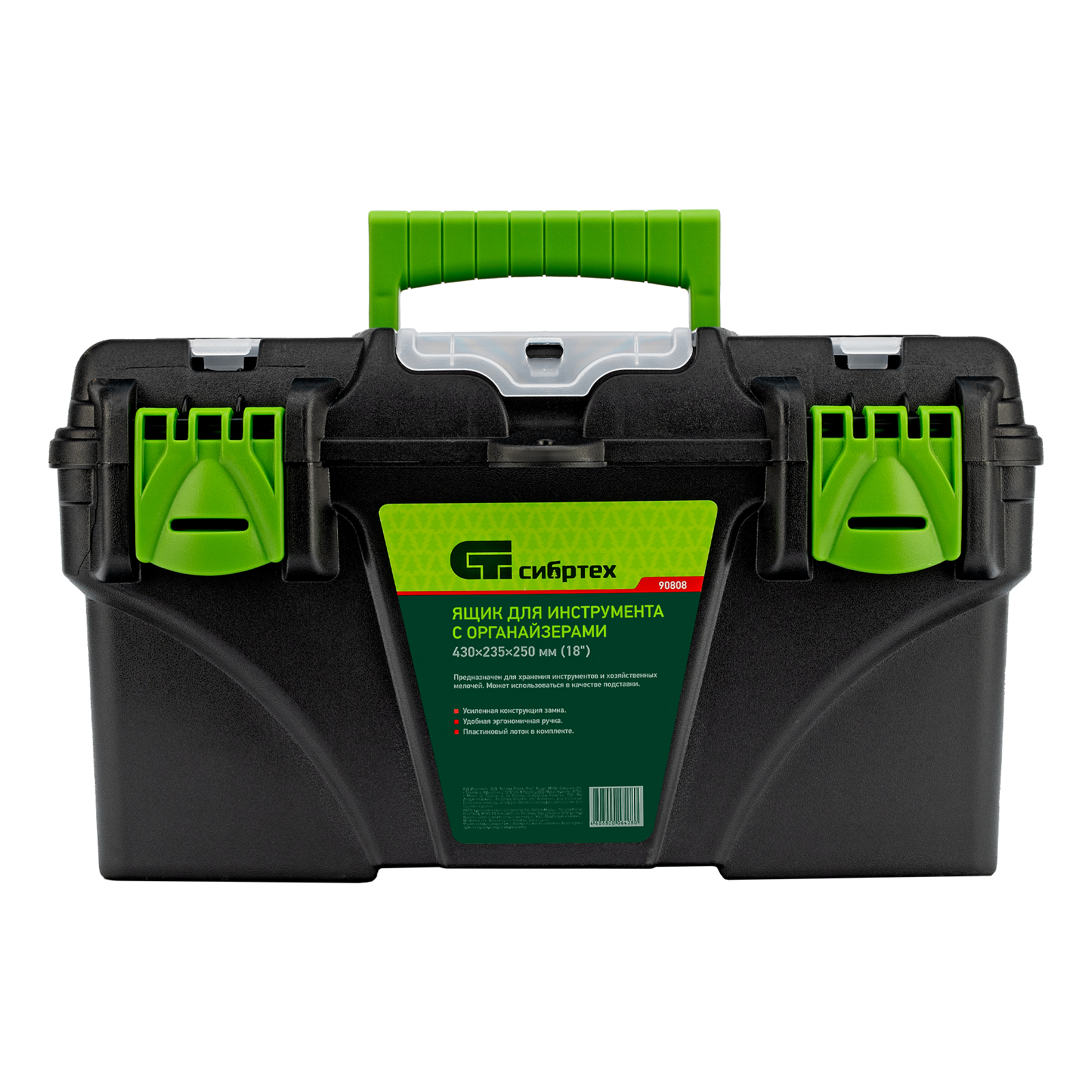 Ящик Сибртех 90808 длиной 18", с органайзерами, используется для хранения и транспортировки инструментов, оснастки, крепежа, хозяйственных мелочей и других предметов. Крышка и замок усилены трехрядными петлями, поэтому ящик выдерживает вес содержимого до 50 кг. Съемный лоток позволяет оптимизировать пространство внутри ящика. Его можно брать в поездку, также он пригодится дома, на даче или в гараже.