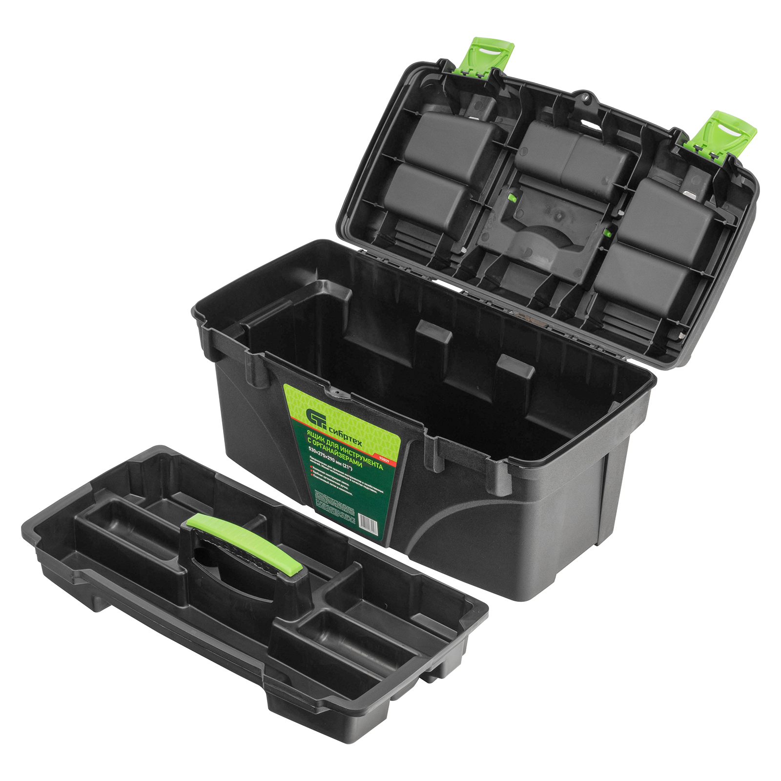 Ящик Сибртех 90809 длиной 21", с органайзерами, используется для хранения и транспортировки инструментов, оснастки, крепежа, хозяйственных мелочей и других предметов. Крышка и замок усилены трехрядными петлями, поэтому ящик выдерживает вес содержимого до 50 кг. Съемный лоток позволяет оптимизировать пространство внутри ящика. Его можно брать в поездку, также он пригодится дома, на даче или в гараже.