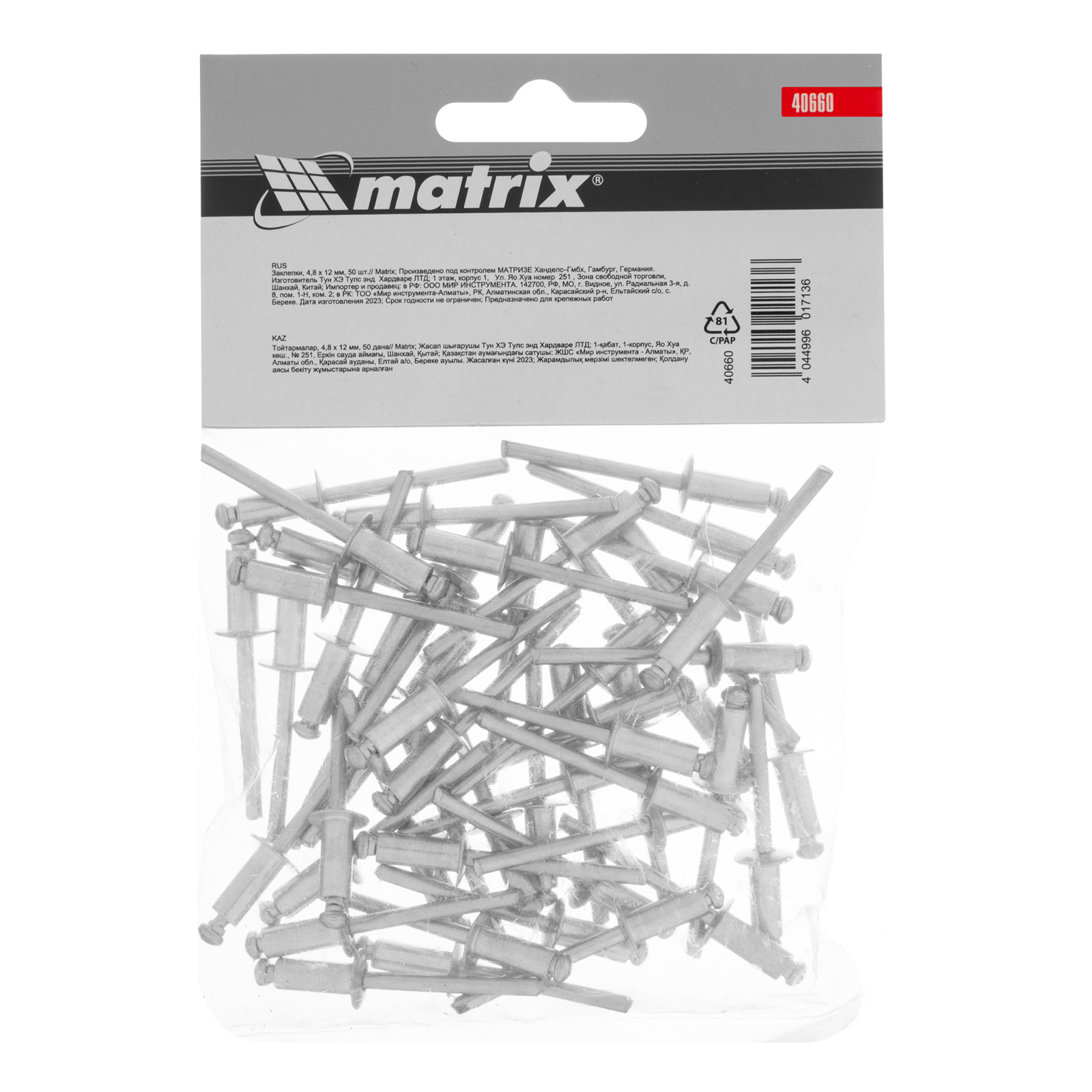 Заклепки Matrix 40660, 4,8 х 12 мм, 50 шт., предназначены для соединения листовых заготовок. Обеспечивают надежную фиксацию материалов даже при наличии доступа только с одной стороны. Используются в строительстве домов, при возведении заборов из профлиста, производстве оборудования, будут полезны в домашней мастерской.