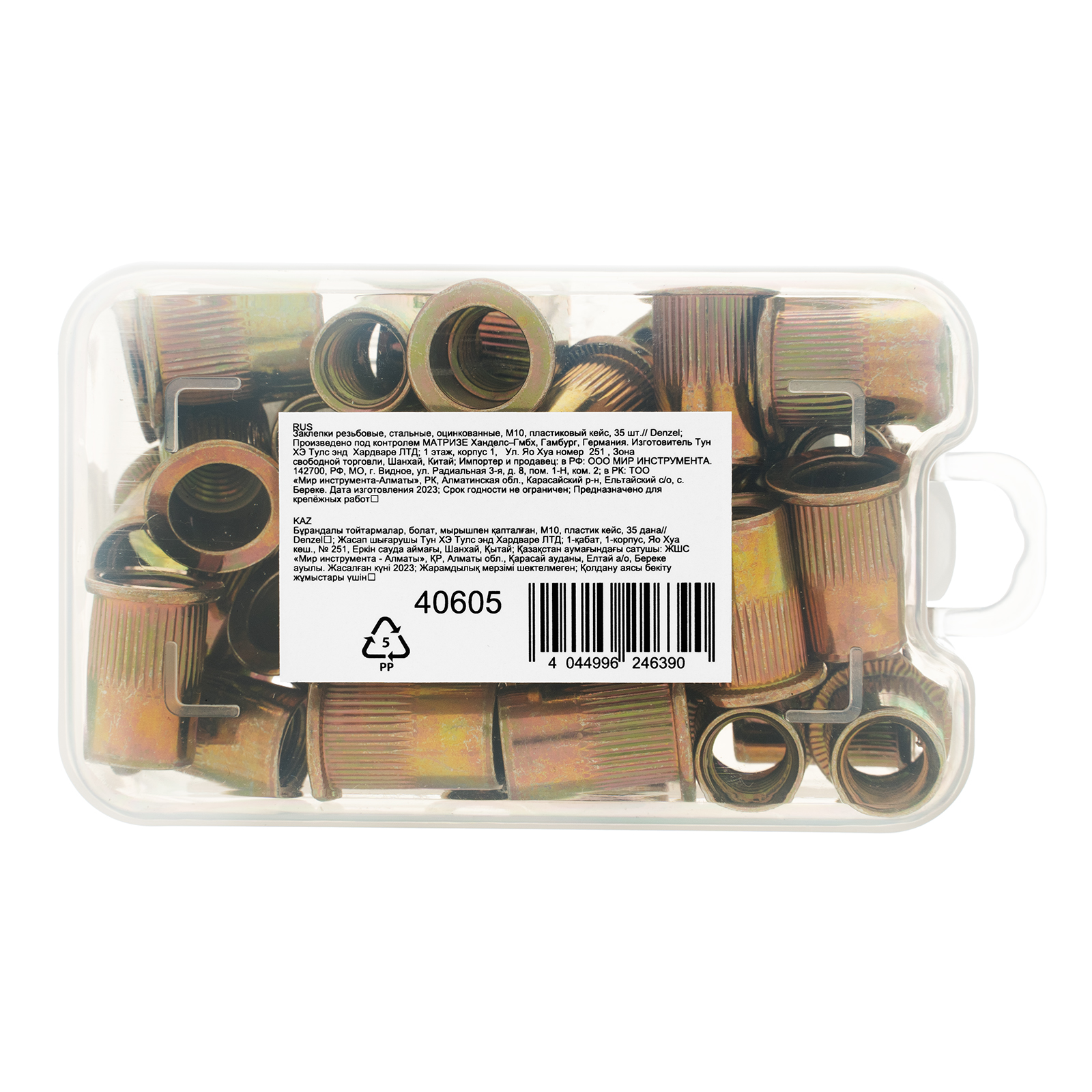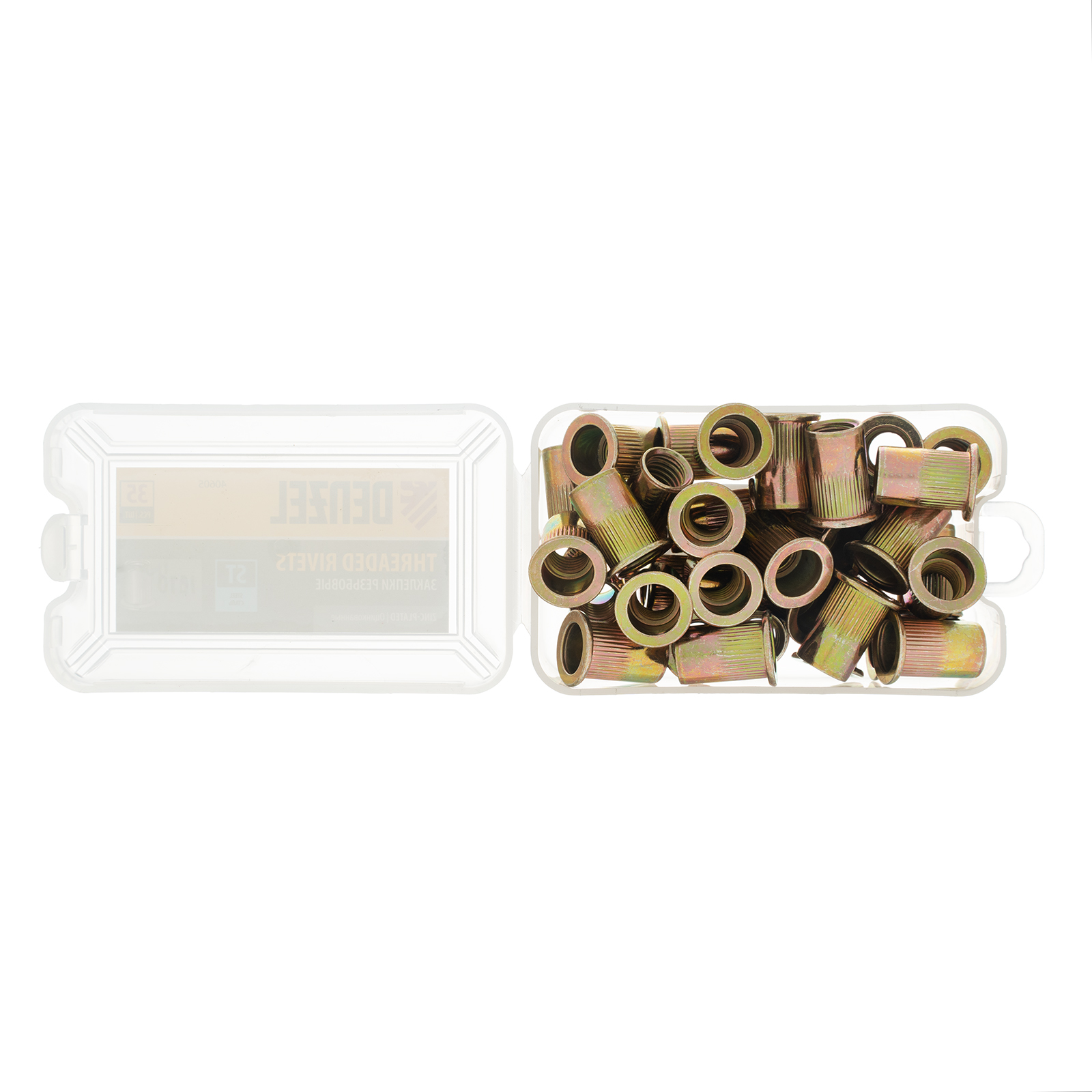 Стальные резьбовые заклепки Denzel 40605 с резьбой M10, оцинкованные, предназначены для скрепления листовых материалов толщиной 1-4 мм. Совместимы с заклепочником Denzel 40501. Позволяют получить резьбовое соединение даже при одностороннем доступе к месту крепления. Крепежные элементы используются для проведения строительных и монтажных работ, пригодятся на даче и в гараже.