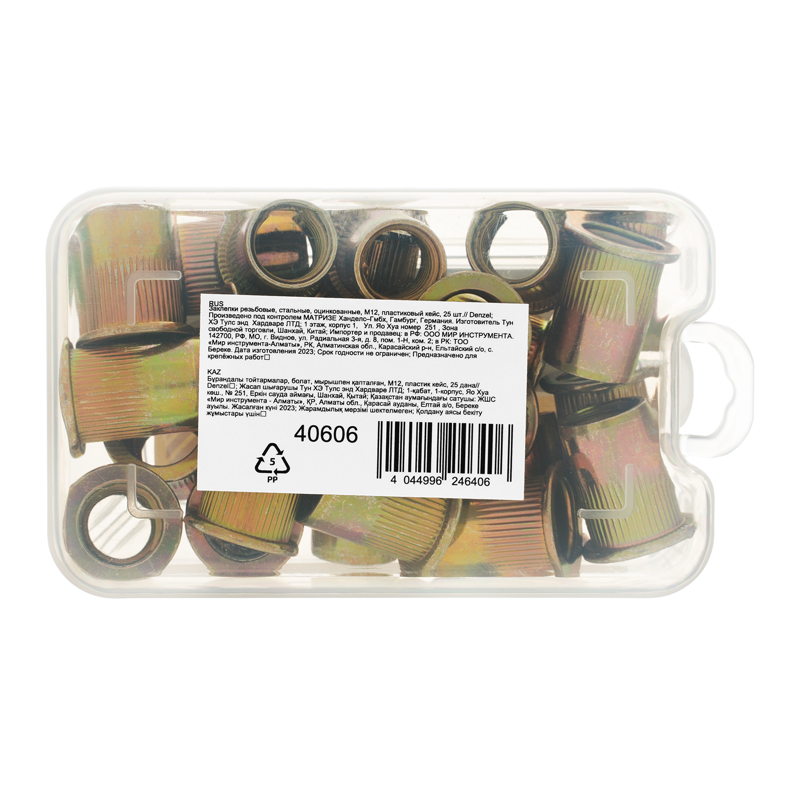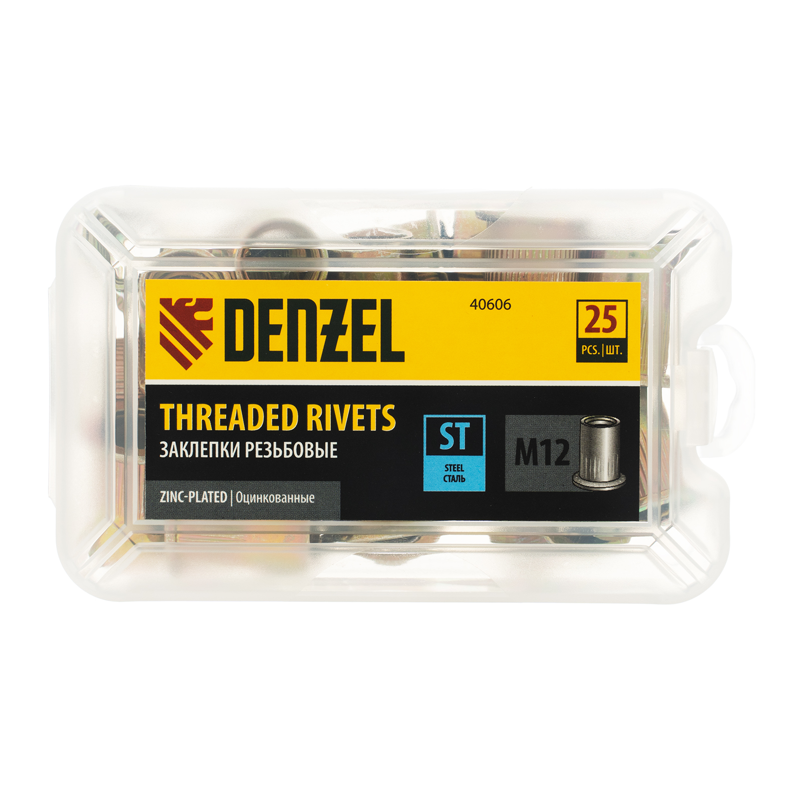 Стальные резьбовые заклепки Denzel 40606 с резьбой M12, оцинкованные, предназначены для скрепления листовых материалов толщиной 1-4 мм. Совместимы с заклепочником Denzel 40501. Позволяют получить резьбовое соединение даже при одностороннем доступе к месту крепления. Крепежные элементы используются для проведения строительных и монтажных работ, пригодятся на даче и в гараже.