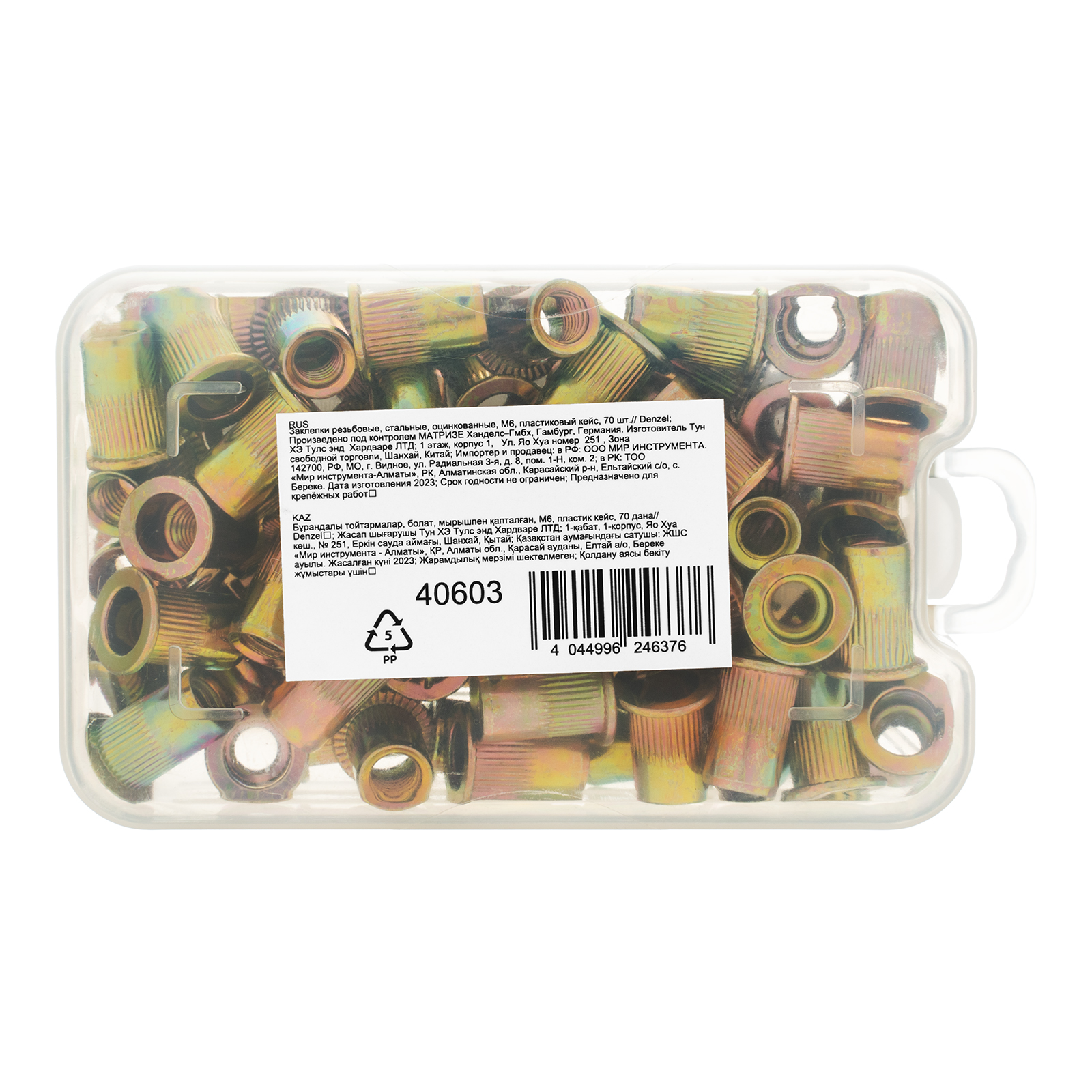 Стальные резьбовые заклепки Denzel 40603, с резьбой M6, оцинкованные, предназначены для скрепления листовых материалов толщиной 0,5-3 мм. Совместимы с заклепочником Denzel 40501. Позволяют получить резьбовое соединение даже при одностороннем доступе к месту крепления. Крепежные элементы используются для проведения строительных и монтажных работ, пригодятся на даче и в гараже.