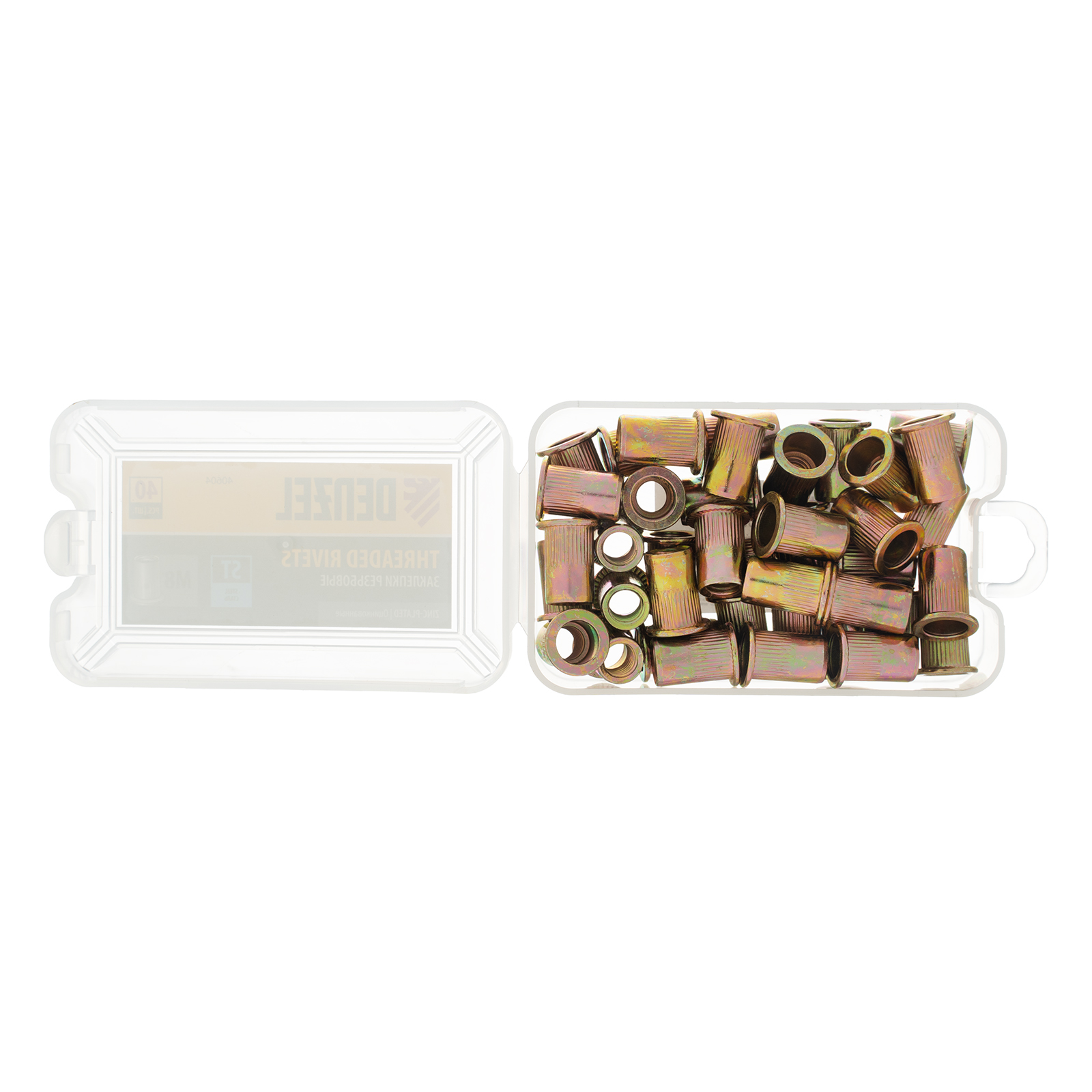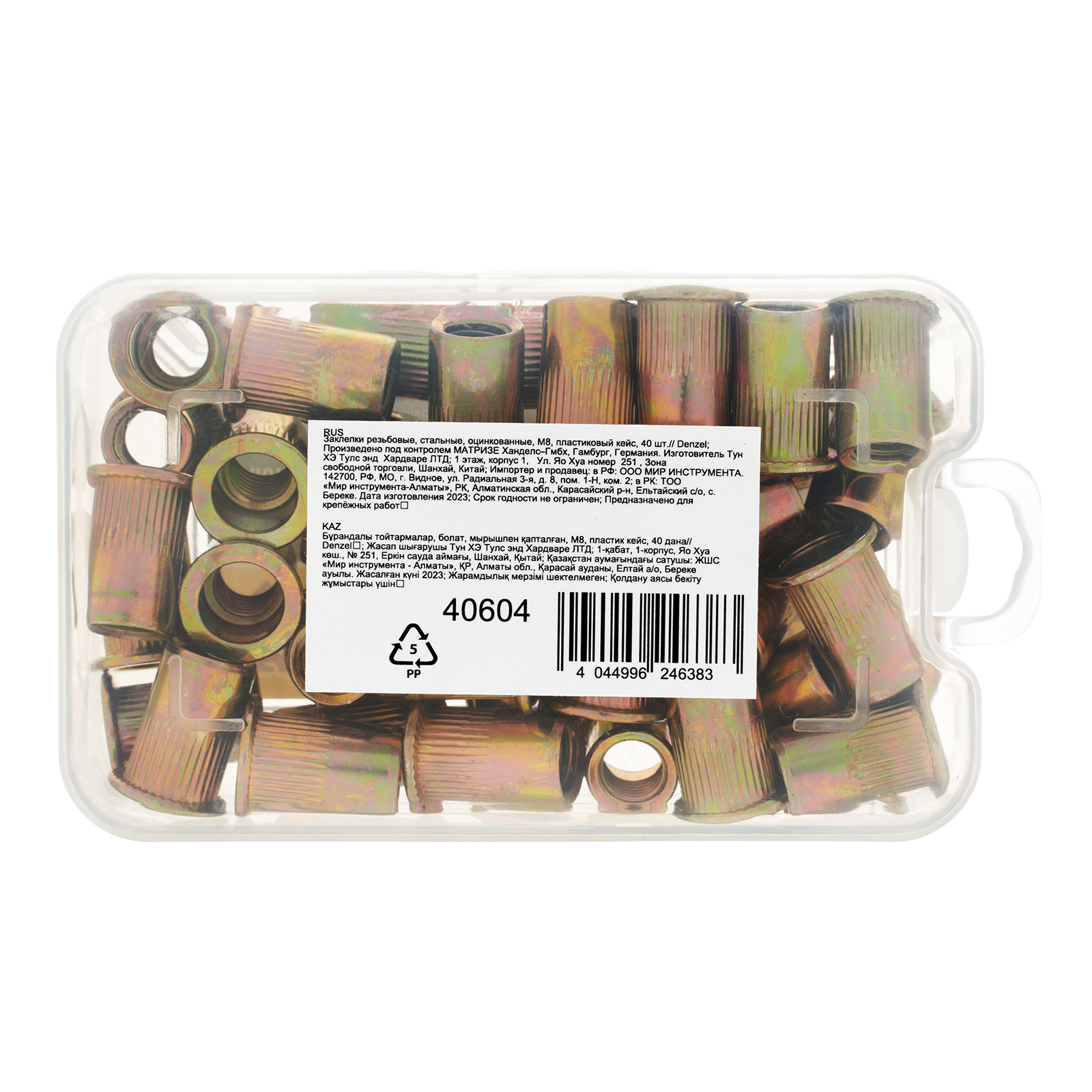 Стальные резьбовые заклепки Denzel 40604, с резьбой M8, оцинкованные, предназначены для скрепления листовых материалов толщиной 1,5-3,5 мм. Совместимы с заклепочником Denzel 40501. Позволяют получить резьбовое соединение даже при одностороннем доступе к месту крепления. Крепежные элементы используются для проведения строительных и монтажных работ, пригодятся на даче и в гараже.