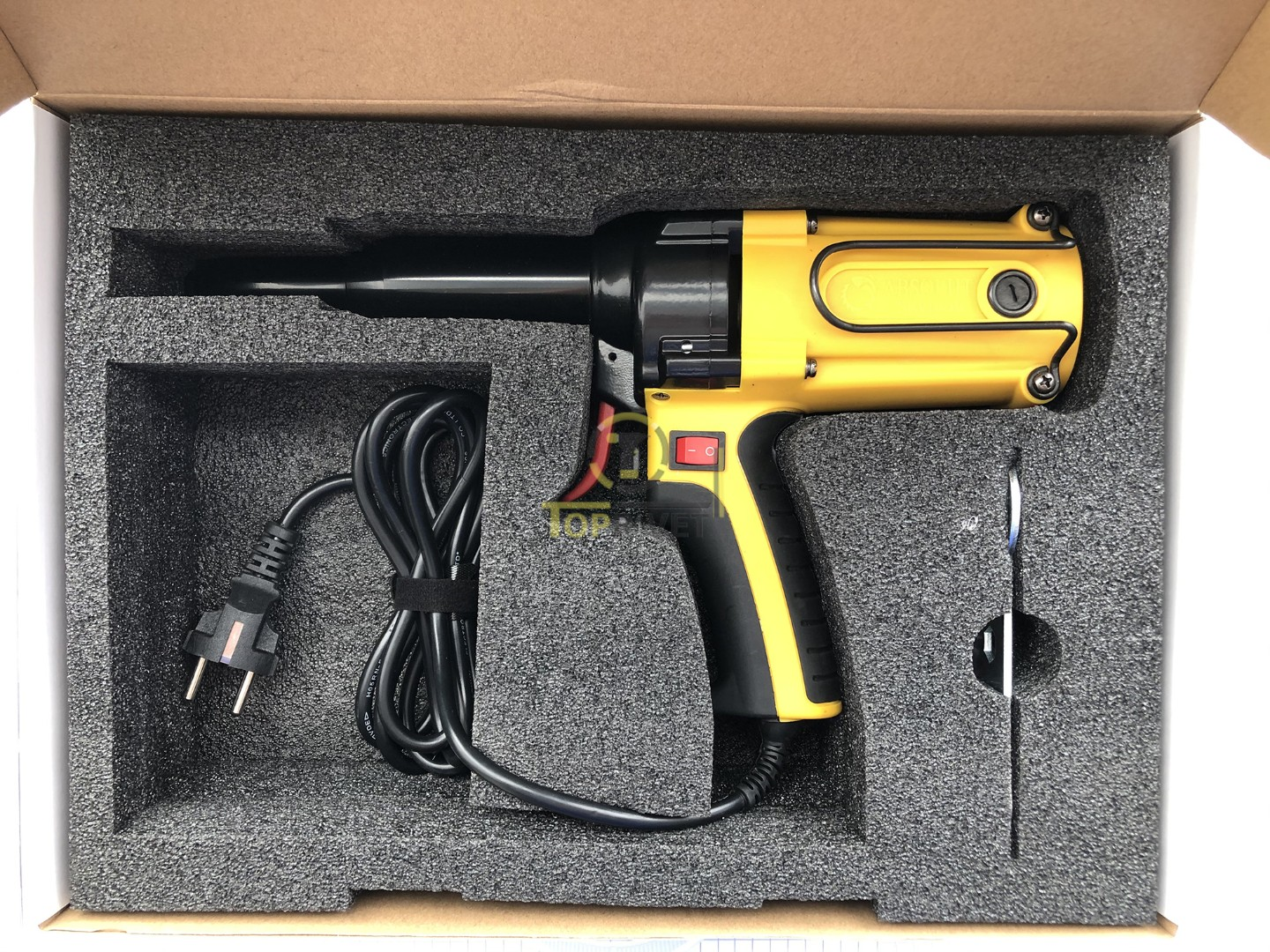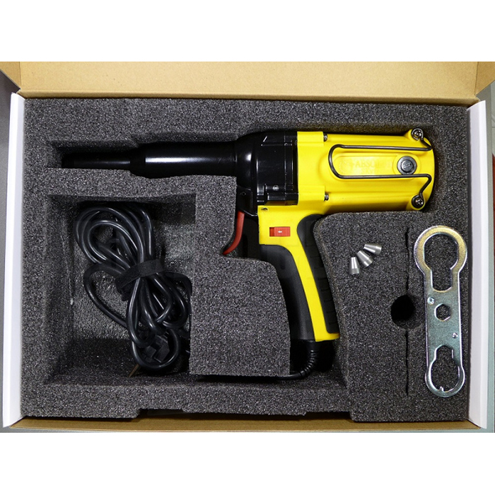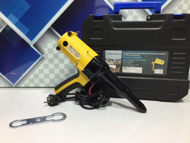 В комплектацию входят монтажный ключ, насадки для заклёпок разных диаметров, комплект губок, инструкция и пластиковый кейс.