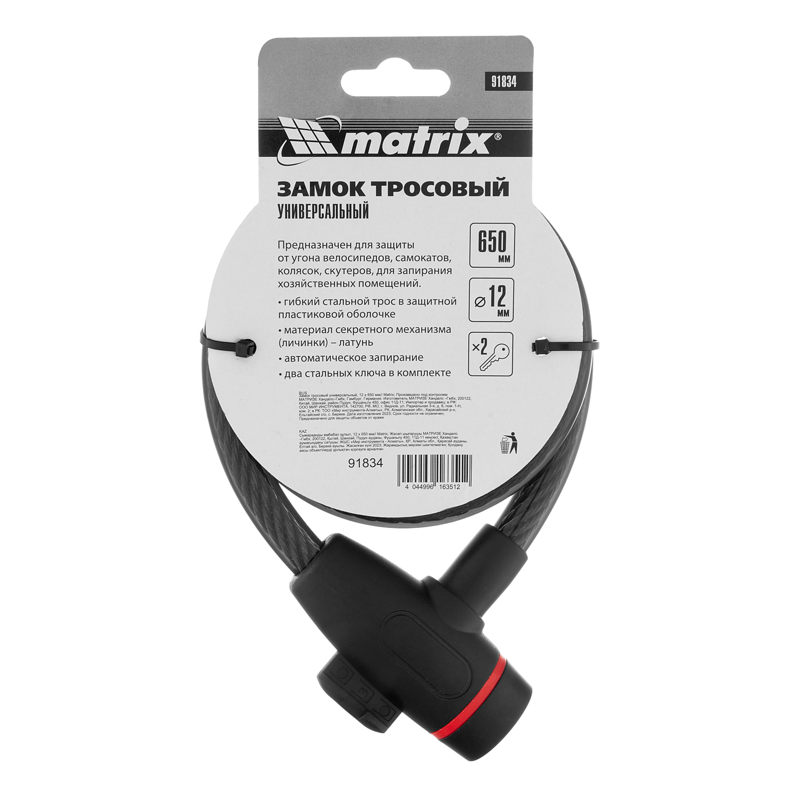 Универсальный тросовый замок 12 х 650 мм Matrix 91834 позволяет обезопасить имущество от кражи. С его помощью можно пристегнуть велосипед, мопед, коляску и т.д. к неподвижной опоре. Также его можно применять для защиты помещений от взлома. Трос весит всего 185 г и помещается в небольшую сумку, поэтому он удобен для транспортировки.